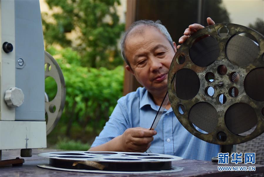 6月30日,朱生榮在當晚電影開播前將膠片調至起始幀。新華社記者鄭夢雨攝