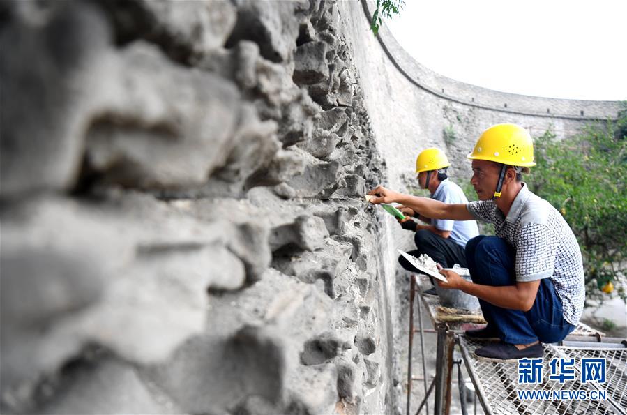 7月2日,工作人員在永年廣府古城修繕城墻。經(jīng)國家文物局和河北省文物局批準(zhǔn),河北永年廣府古城修繕工程已全面啟動(dòng)。在文物專家全程參與下,按照“不改變文物原狀”原則進(jìn)行修繕,預(yù)計(jì)2021年4月底完工。永年廣府古城擁有華北地區(qū)保存最完整的古城墻,現(xiàn)為全國重點(diǎn)文物保護(hù)單位。新華社記者王曉攝