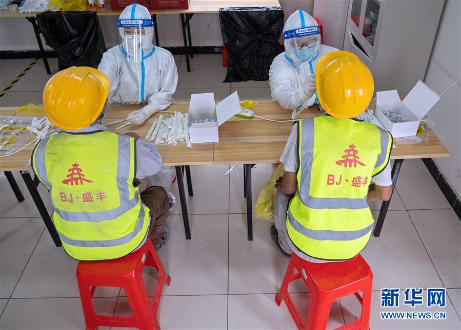 當(dāng)日,在北京市大興區(qū)中建三局二公司北京公司一項目建筑工地的臨時核酸檢測采樣點,醫(yī)護人員為1353名建筑工地人員進行核酸檢測采樣。新華社記者才揚攝