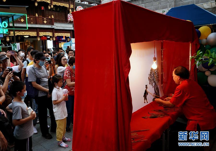 7月3日,游人在上海豫園中心廣場(chǎng)上觀看皮影表演。從7月第一個(gè)周末起,上海豫園原有的“豫園六點(diǎn)半”集市全面升級(jí),煥彩燈光、演藝活動(dòng)和花車集市全線更新,讓市民和游客在觀燈、觀人、觀演的沉浸式體驗(yàn)中,享受夏日特色的“食玩”樂(lè)趣。新華社記者 劉穎 攝
