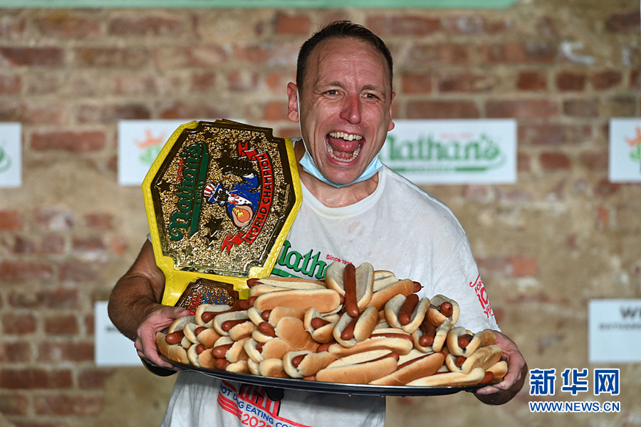 7月4日,美國紐約布魯克林舉行一年一度的國際吃熱狗比賽,喬伊·切斯納特以吃75個熱狗的成績贏得男子賽區(qū)冠軍,創(chuàng)下了新的世界紀(jì)錄。(圖片來源:視覺中國)