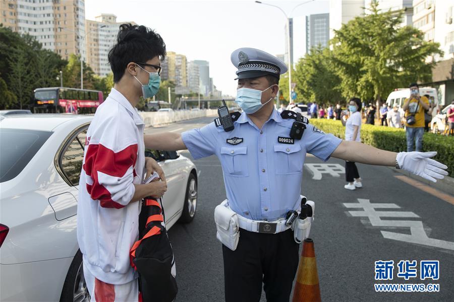7月7日,在位于北京的中國人民大學(xué)附屬中學(xué)考點(diǎn)外,北京市公安局公安交通管理局海淀交通支隊(duì)中關(guān)村大隊(duì)交警殷宏偉(右)指揮前來送考生的車輛有序停好,引導(dǎo)考生迅速前往考點(diǎn)。當(dāng)日,2020年高考拉開帷幕。新華社記者沈伯韓攝
