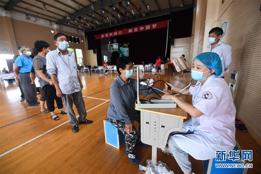 7月8日,在杭州市富陽區(qū)東洲街道安置點(diǎn)東洲中心小學(xué),醫(yī)護(hù)人員在給村民測量血壓。新華社記者徐昱攝