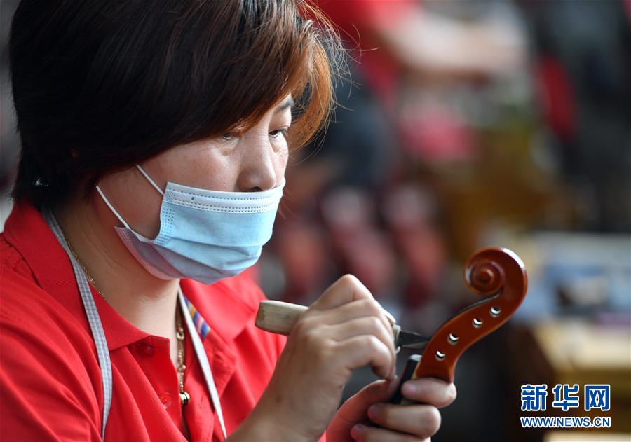 工人在河南駐馬店市確山縣提琴產(chǎn)業(yè)園提琴生產(chǎn)車間雕刻琴頭(7月3日攝)。新華社記者李嘉南攝