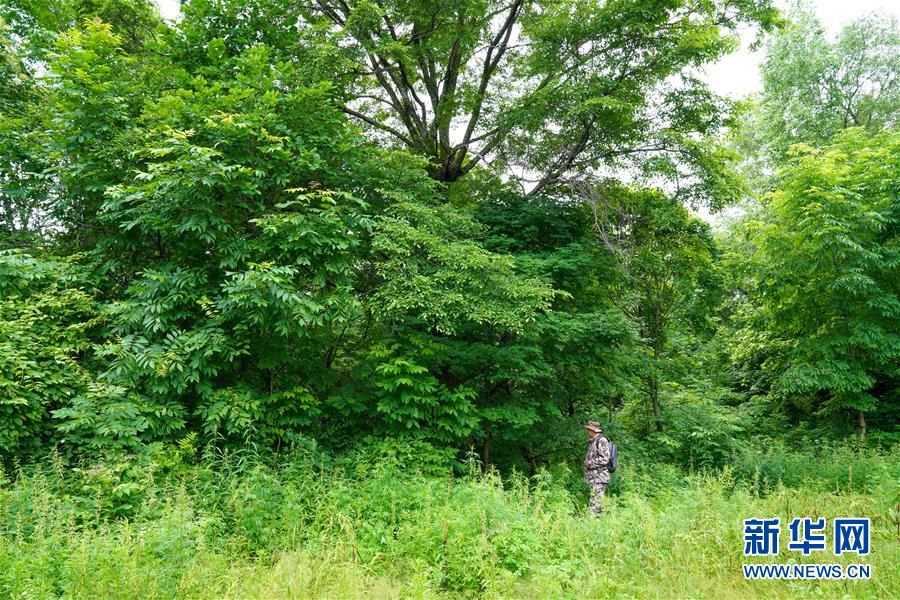 董紅雨在迎春林業(yè)局有限公司施業(yè)區(qū)內(nèi)進(jìn)行野生東北虎信息搜集和巡護(hù)工作(7月8日攝)。新華社記者馬曉成攝