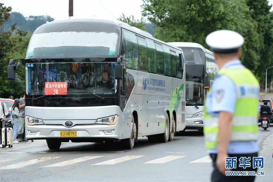 7月9日,接送考生的大巴車(chē)抵達(dá)歙縣第二中學(xué)考點(diǎn)。受強(qiáng)降雨影響,2020年高考安徽歙縣考區(qū)7月7日未能如期開(kāi)考,經(jīng)研究并報(bào)教育部批準(zhǔn),歙縣考區(qū)于9日啟用2020年普通高等學(xué)校招生全國(guó)統(tǒng)一考試語(yǔ)文、數(shù)學(xué)(文、理)科目副題進(jìn)行考試。新華社記者黃博涵攝