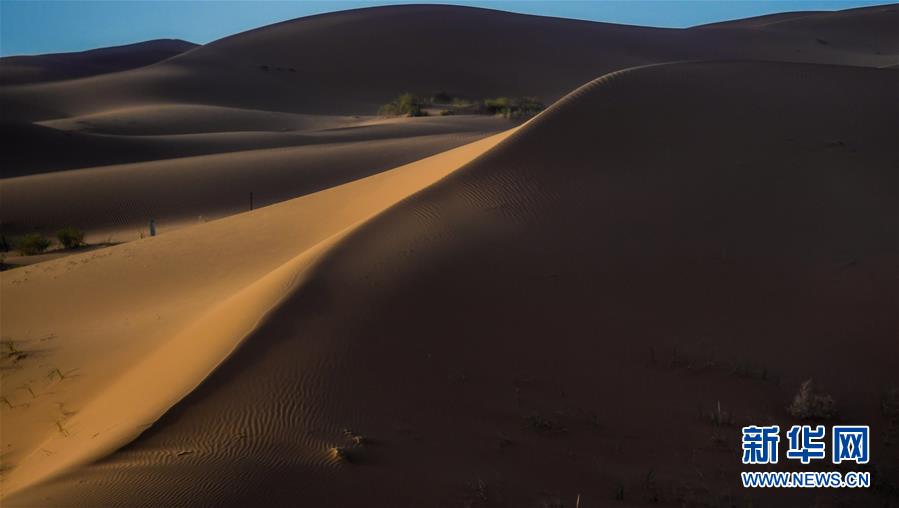 這是7月8日拍攝的騰格里沙漠風(fēng)光。位于內(nèi)蒙古自治區(qū)阿拉善左旗西南部和甘肅省中部邊境的騰格里沙漠是我國(guó)第四大沙漠,總面積約為4.3萬(wàn)平方公里。夏日傍晚,騰格里沙漠連綿的沙丘被日光勾勒出美麗的線條,美不勝收。新華社記者連振攝