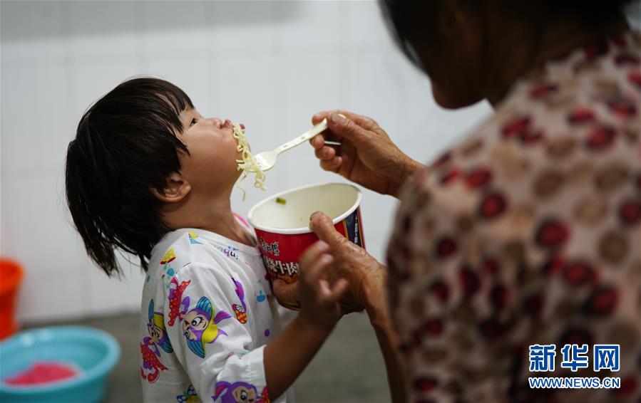 7月9日,村民在給小朋友喂飯。當日,江西鄱陽縣鄱陽鎮(zhèn)因洪水受災的村民被轉移到多個集中安置點。在鄱陽縣五一中心學校安置點,志愿者和工作人員接到任務后不到十小時內,為被轉移村民布置了28間教室,供519人安頓,并為村民發(fā)放褥子、床單、枕頭、盒飯、飲用水等物資。新華社記者周密攝