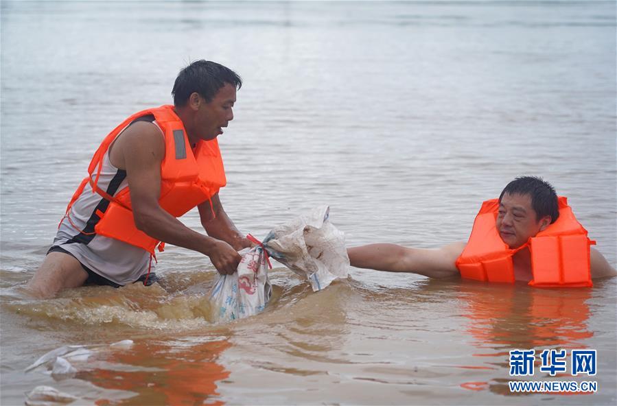 7月9日,為應(yīng)對洪峰到來,邵忠如(左)在水中加固圩堤。新華社記者萬象攝