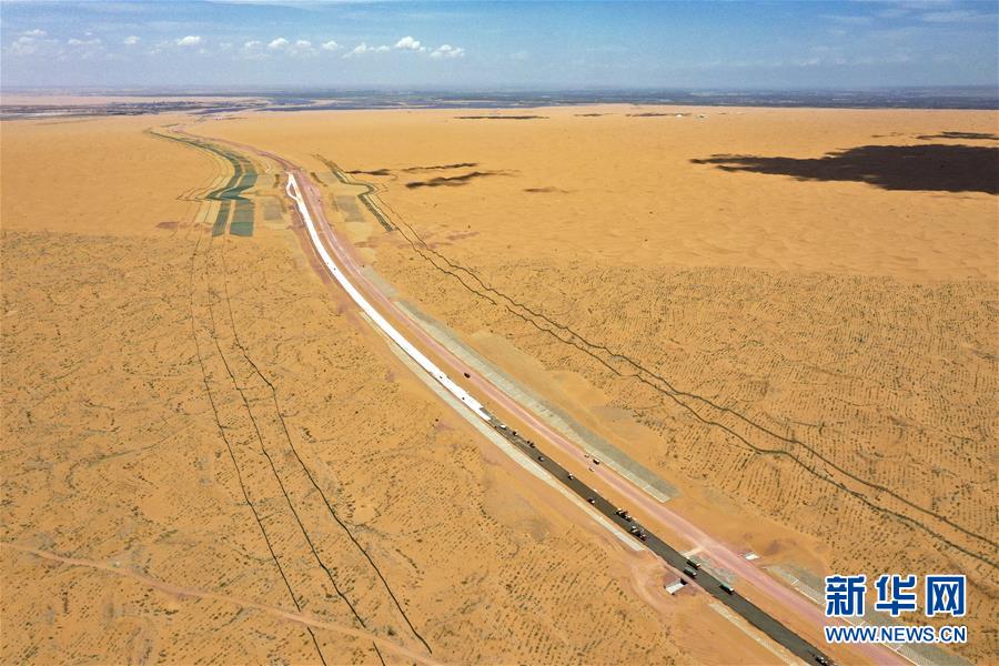 7月10日,位于寧夏境內(nèi)的烏瑪高速青銅峽至中衛(wèi)段A10標(biāo)段在施工中(無人機(jī)照片)。盛夏時(shí)節(jié),位于寧夏境內(nèi)的烏瑪(內(nèi)蒙古烏海市至青?,斍呖h)高速青銅峽至中衛(wèi)段正在抓緊施工建設(shè)。該路段主線全長(zhǎng)122.9公里,其中穿越騰格里沙漠腹地的18公里公路是寧夏建設(shè)的首條沙漠高速公路,預(yù)計(jì)2021年建成通車。新華社記者馮開華攝。