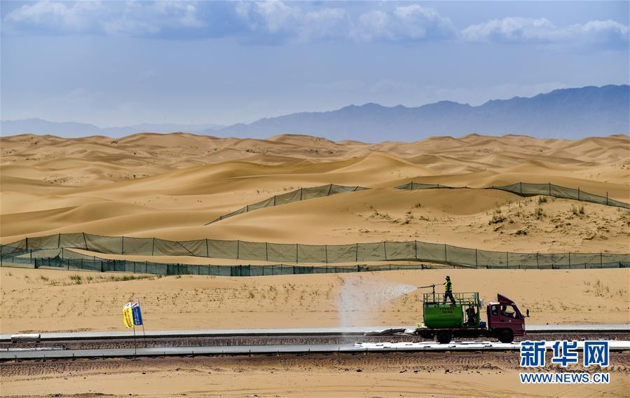 7月10日,工人在位于寧夏境內(nèi)的烏瑪高速青銅峽至中衛(wèi)段A9標(biāo)段施工。盛夏時節(jié),位于寧夏境內(nèi)的烏瑪(內(nèi)蒙古烏海市至青海瑪沁縣)高速青銅峽至中衛(wèi)段正在抓緊施工建設(shè)。該路段主線全長122.9公里,其中穿越騰格里沙漠腹地的18公里公路是寧夏建設(shè)的首條沙漠高速公路,預(yù)計(jì)2021年建成通車。新華社記者馮開華攝。