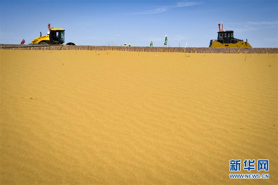 7月10日,工人在位于寧夏境內(nèi)的烏瑪高速青銅峽至中衛(wèi)段A10標(biāo)段施工。盛夏時(shí)節(jié),位于寧夏境內(nèi)的烏瑪(內(nèi)蒙古烏海市至青海瑪沁縣)高速青銅峽至中衛(wèi)段正在抓緊施工建設(shè)。該路段主線全長122.9公里,其中穿越騰格里沙漠腹地的18公里公路是寧夏建設(shè)的首條沙漠高速公路,預(yù)計(jì)2021年建成通車。新華社記者馮開華攝。