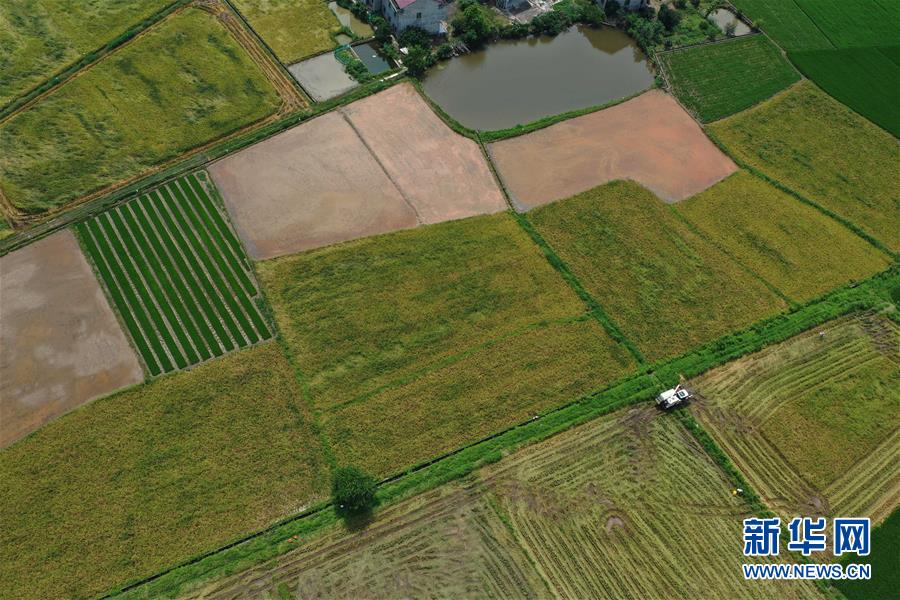 7月11日,在湖南省衡陽市衡陽縣臺源鎮(zhèn)臺九村,村民駕駛收割機(jī)收割早稻(無人機(jī)照片)。近日,湖南各地農(nóng)村陸續(xù)進(jìn)入“雙搶”季,農(nóng)民緊抓農(nóng)時(shí),搶收搶種,力爭糧食穩(wěn)產(chǎn)豐收。新華社記者趙眾志攝