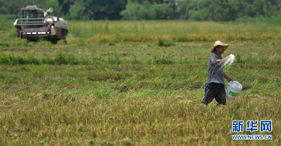 7月11日,村民在湖南省衡陽市衡陽縣臺源鎮(zhèn)臺九村收割后的稻田施肥,為種植晚稻做準備。近日,湖南各地農村陸續(xù)進入“雙搶”季,農民緊抓農時,搶收搶種,力爭糧食穩(wěn)產豐收。新華社記者趙眾志攝