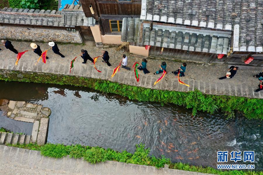 7月4日,浦源村民展示魚祭習(xí)俗(無人機(jī)照片)。魚祭習(xí)俗是為死去的鯉魚舉行送葬儀式,是浦源村特有的習(xí)俗。新華社記者 姜克紅 攝