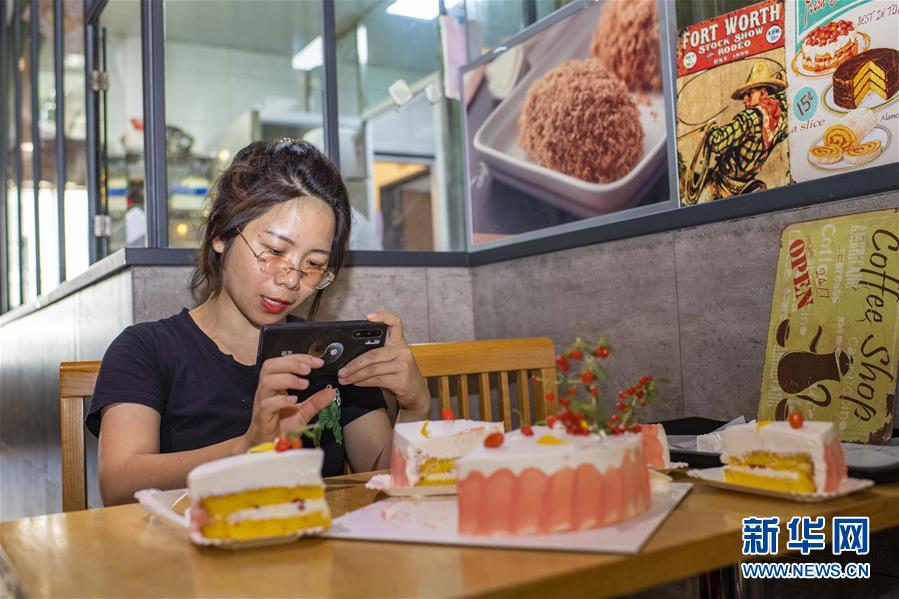 在位于新疆精河縣城的一家糕點店,朱虹美在錄制視頻,介紹創(chuàng)意食品——由枸杞果醬、鮮枸杞制作的“枸杞蛋糕”(7月11日攝)。朱虹美計劃聯(lián)合精河其他行業(yè),一起推廣枸杞。新華社記者 胡虎虎 攝