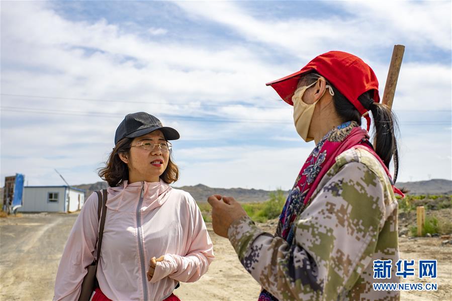 在新疆精河縣城近郊的一處枸杞園,朱虹美(左)與一位杞農(nóng)聊天(7月11日攝)。新華社記者 胡虎虎 攝