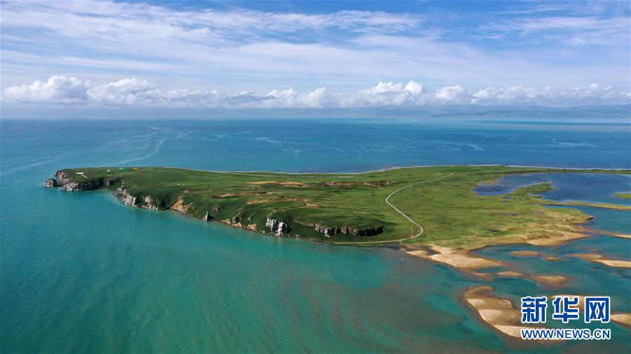 7月10日拍攝的青海湖風光(無人機照片)。盛夏時節(jié),被譽為“中國最美湖泊”的青海湖畔景色宜人,藍天、白云、湖水與草原組成一幅壯美的畫卷。新華社記者 張宏祥 攝