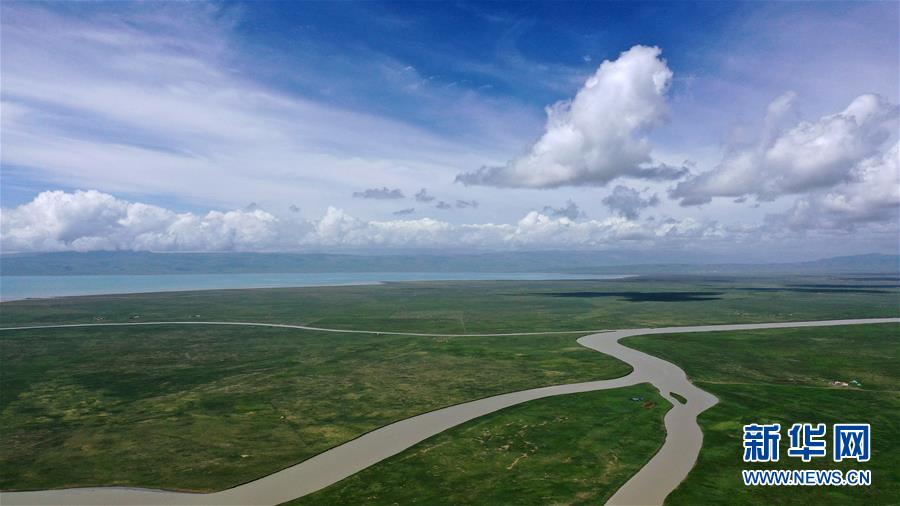 7月10日拍攝的青海湖畔風(fēng)光(無人機(jī)照片)。盛夏時(shí)節(jié),被譽(yù)為“中國(guó)最美湖泊”的青海湖畔景色宜人,藍(lán)天、白云、湖水與草原組成一幅壯美的畫卷。新華社記者 張宏祥 攝