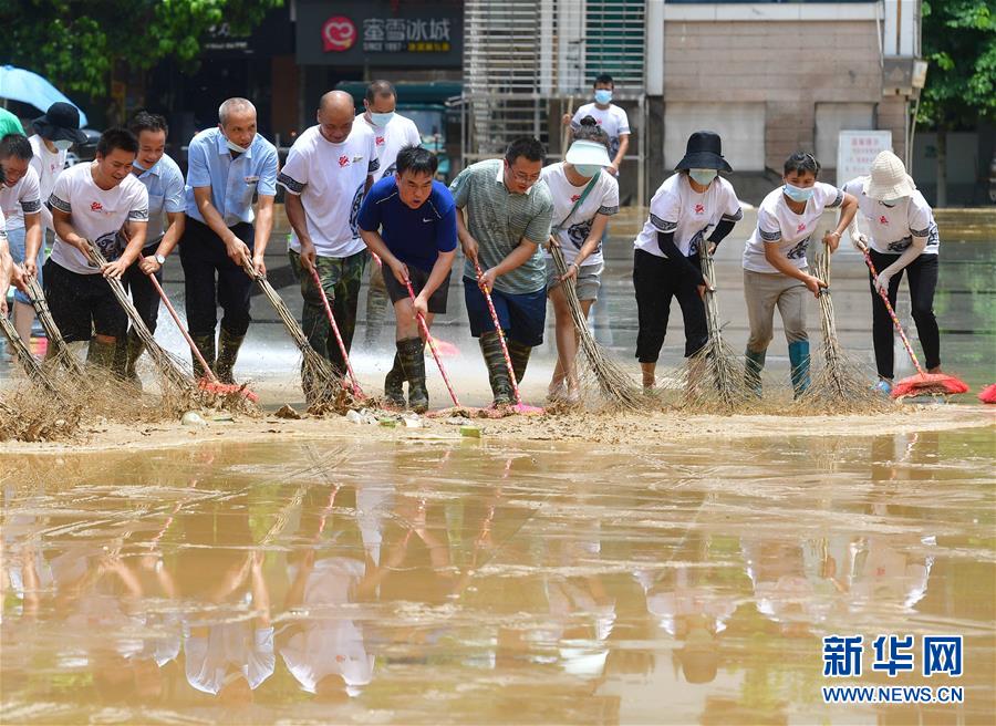 7月12日,融水苗族自治縣文化體育廣電和旅游局清淤小分隊在蘆笙廣場清理地面。當日,在廣西柳州市融水苗族自治縣,融江洪水退去,當?shù)叵嚓P(guān)部門組織多支清淤排險小分隊,積極開展災(zāi)后恢復工作。新華社記者 黃孝邦 攝