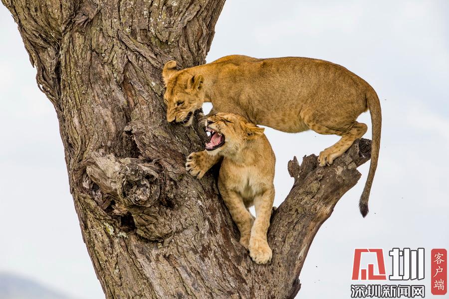 2020年7月13日?qǐng)?bào)道(具體拍攝時(shí)間不詳),Sandesh Kadur是一名印度野生動(dòng)物攝影師,他在坦桑尼亞塞倫蓋蒂國(guó)家公園拍攝到一系列“獅子上樹”的精彩照片。畫面中,有一只憤怒的母獅為了捍衛(wèi)自己在樹上的位置,一邊劈叉一邊對(duì)著鏡頭咆哮,有兩只獅子為了爭(zhēng)奪位置互相攻擊,還有一只獅子在找到舒適的位置后呼呼大睡。