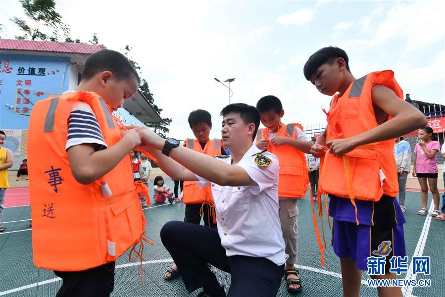 7月13日,在廣西融水苗族自治縣桿洞鄉(xiāng)黨鳩小學(xué),融水海事處工作人員指導(dǎo)學(xué)生穿救生衣。當(dāng)日,廣西柳州融水海事處在桿洞鄉(xiāng)黨鳩小學(xué)開展防溺水及水上交通安全知識教育活動(dòng),向?qū)W生們普及水上安全知識,并講解水上應(yīng)急救援技能。新華社記者 黃孝邦 攝