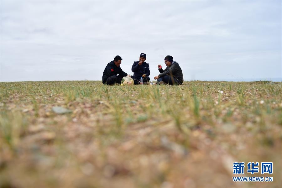 在可可西里索南達(dá)杰保護(hù)站,龍周才加(中)與隊(duì)友才仁多杰(左)、王文豪在管護(hù)區(qū)域巡查時(shí)吃午飯(6月30日攝)。新華社記者 張龍 攝