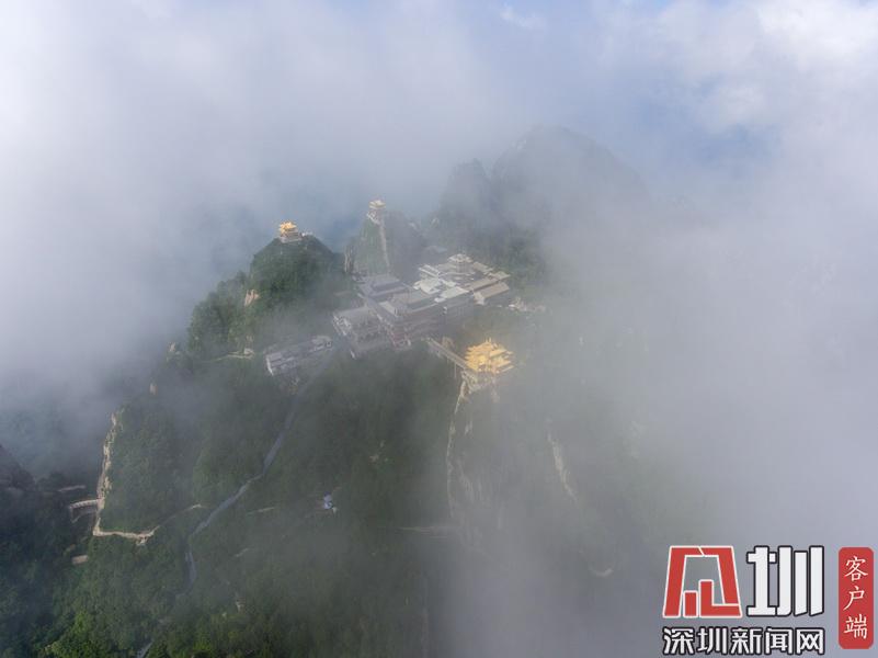 在海拔2217米的山頂上,矗立著3座明清皇家宮殿建筑風(fēng)格的建筑,山峰高聳、山谷深不見底,這些建筑群宛如“漂浮”在云端,巧奪天工,似人間仙境。