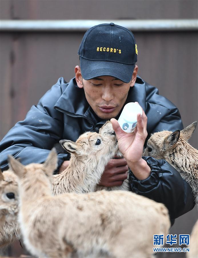 7月7日,三江源國家公園管理局長江源園區(qū)可可西里管理處卓乃湖保護站的工作人員才文多杰在給藏羚羊幼仔喂奶。新華社記者 薛玉斌 攝