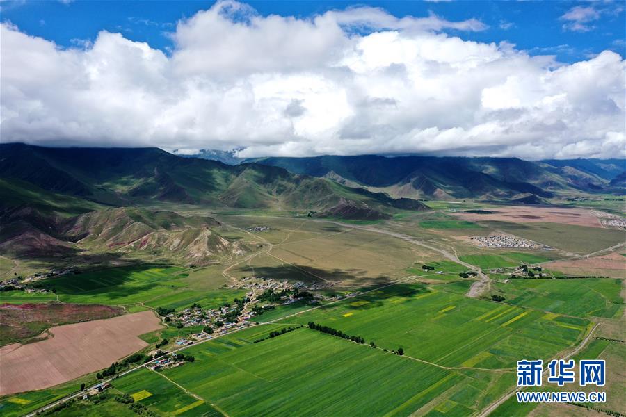 拉薩市林周縣卡孜鄉(xiāng)田園景色(7月14日攝,無人機照片)。林周縣地處西藏中部,拉薩河上游。夏日時節(jié),這里水草豐茂,綠意盎然,河流、村落、農田組成一幅美麗的田園畫卷。新華社記者 詹彥 攝