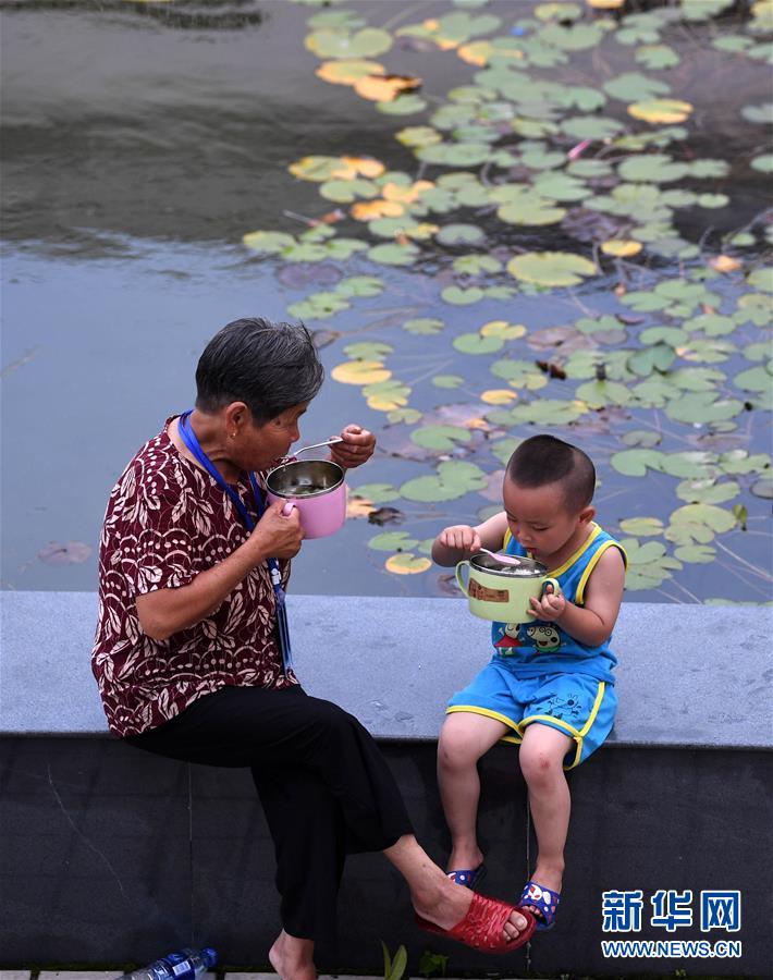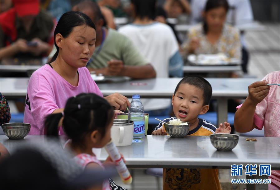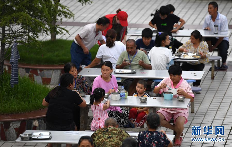 7月14日,在宿松縣洲頭鄉(xiāng)中心小學集中安置點,洲頭鄉(xiāng)泗洲村的村民在吃晚餐。近日,安徽省宿松縣洲頭鄉(xiāng)泗洲村的300多名村民因洪水被轉移到該鄉(xiāng)中心小學集中安置點。安置點工作人員、志愿者利用學校食堂為村民們烹飪飯菜,讓村民們在安置點吃上熱騰騰的三餐。新華社記者 劉軍喜 攝