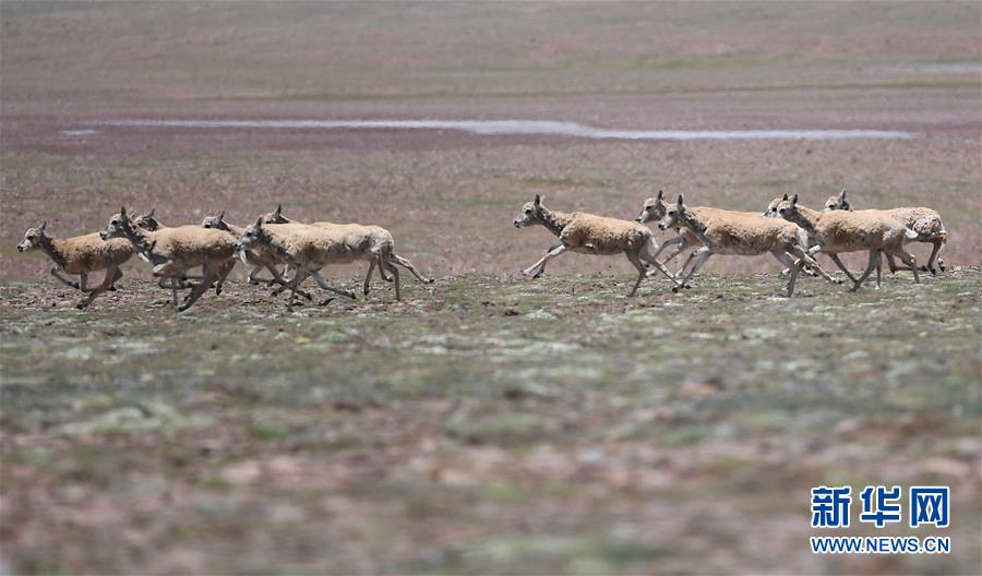 7月7日在可可西里卓乃湖區(qū)域拍攝的藏羚羊。目前正值藏羚羊產(chǎn)仔季。來自青海三江源、新疆阿爾金山、西藏羌塘等地的藏羚羊來到位于青海省可可西里腹地、被譽(yù)為“藏羚羊大產(chǎn)房”的卓乃湖區(qū)域產(chǎn)仔。新華社記者 薛玉斌 攝