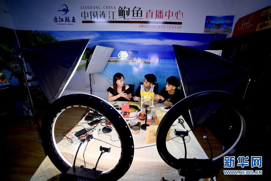 7月14日,在福建省連江縣鮑魚產(chǎn)品直播中心,工作人員在網(wǎng)上直播銷售鮑魚產(chǎn)品。新華社記者 姜克紅 攝