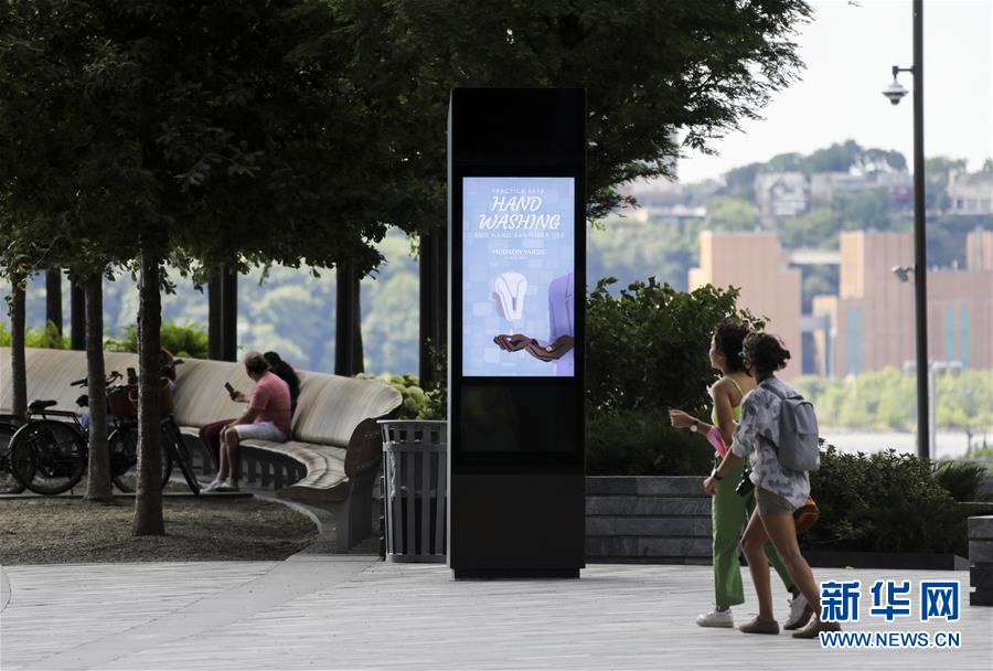 7月14日,在美國紐約一家尚未恢復(fù)店內(nèi)購物的購物中心外,電子屏介紹正確洗手的方式。美國約翰斯·霍普金斯大學(xué):截至北京時間15日6時34分,全球新冠確診病例達13258016例,死亡病例為576752例。美國是全球疫情最嚴(yán)重的國家,確診病例達3416222例,死亡病例為136319例。新華社記者 王迎 攝