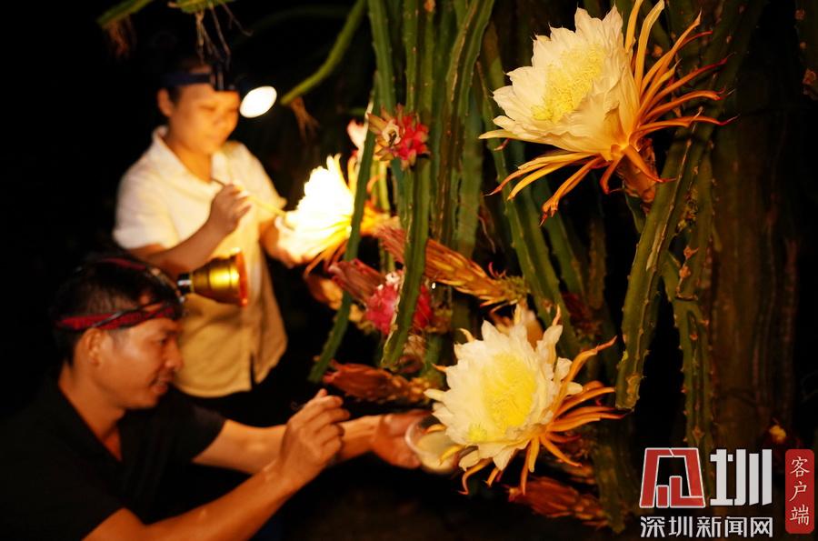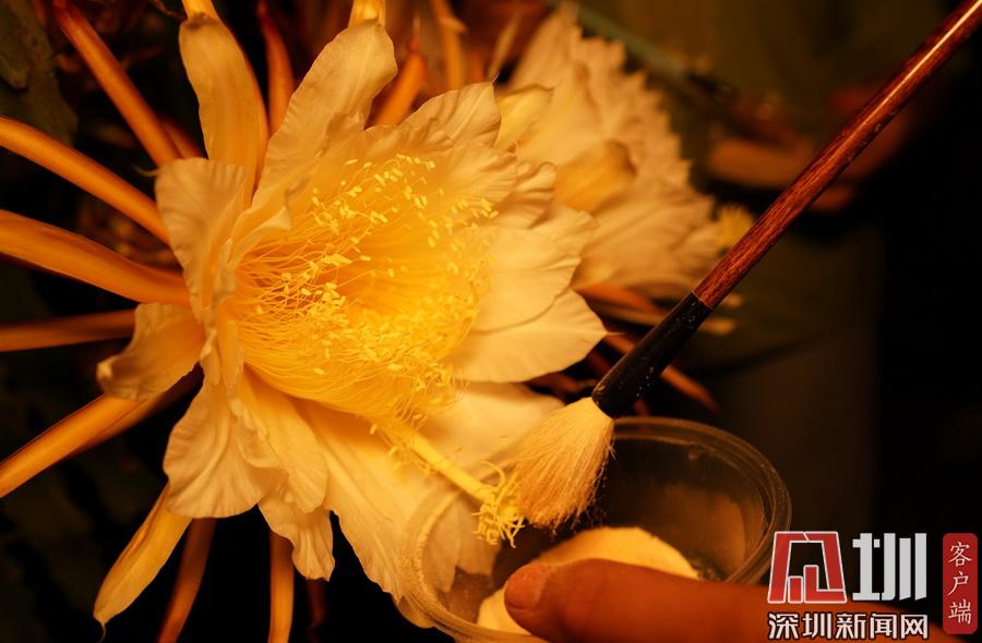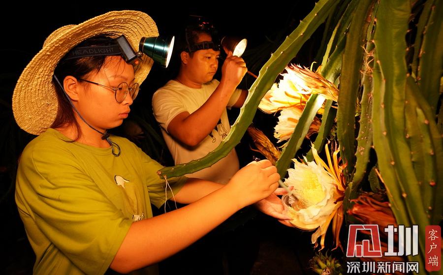 2020年7月14日晚,在廣西融水苗族自治縣融水鎮(zhèn)三合村黎鄧屯,兩名村民正在給紅心火龍果“點(diǎn)花”。