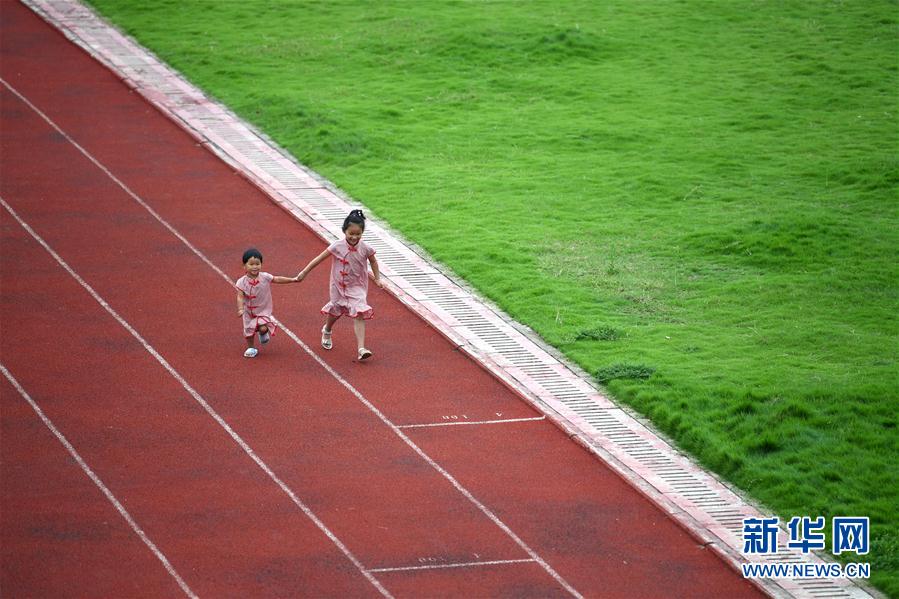 7月16日,在安徽省宿松縣洲頭鄉(xiāng)中心小學(xué)集中安置點,小朋友在操場上玩耍。新華社記者劉軍喜攝