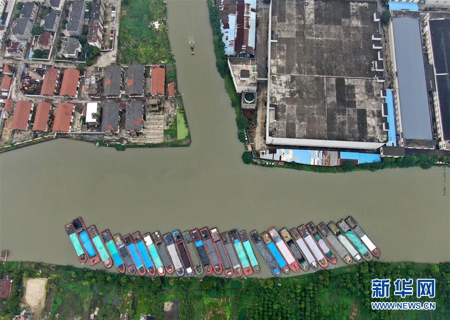 7月17日拍攝的秀洲區(qū)王江涇鎮(zhèn)境內(nèi)京杭大運(yùn)河邊臨時(shí)??康拇埃o人機(jī)照片)。浙江省嘉興市秀洲區(qū)處在杭嘉湖平原的低洼地帶,受持續(xù)強(qiáng)降雨及上游排水影響,秀洲區(qū)境內(nèi)的京杭大運(yùn)河分支航道持續(xù)保持較高水位。為確保安全度汛,秀洲區(qū)相關(guān)部門全力以赴做好防汛各項(xiàng)工作。新華社記者韓傳號(hào)攝