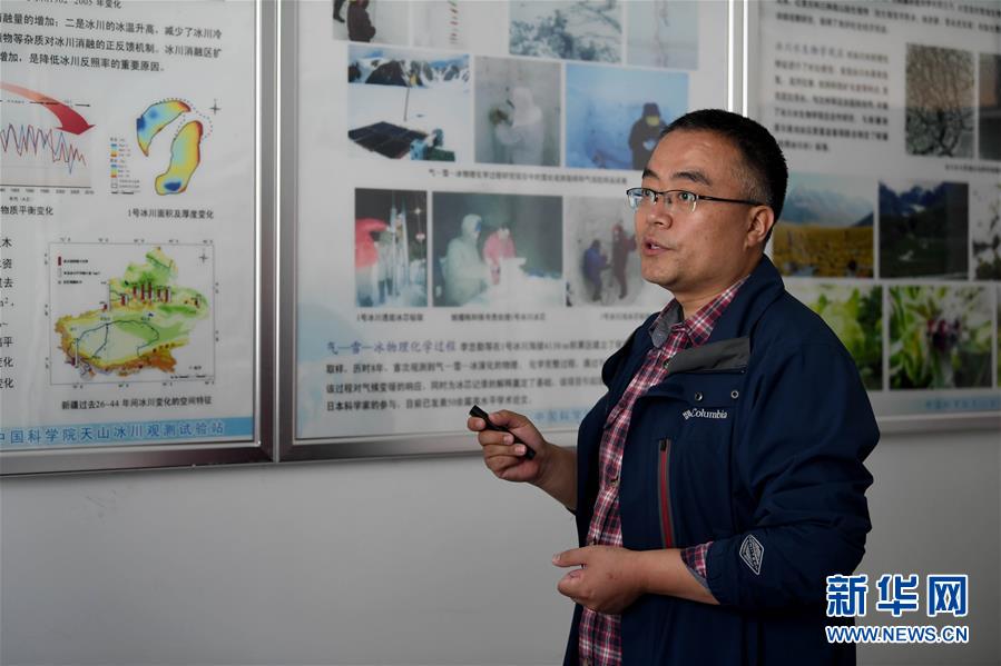 7月16日,中國科學院西北生態(tài)環(huán)境資源研究院天山冰川觀測試驗站工程師周平介紹天山一號冰川情況。新華社記者沙達提攝