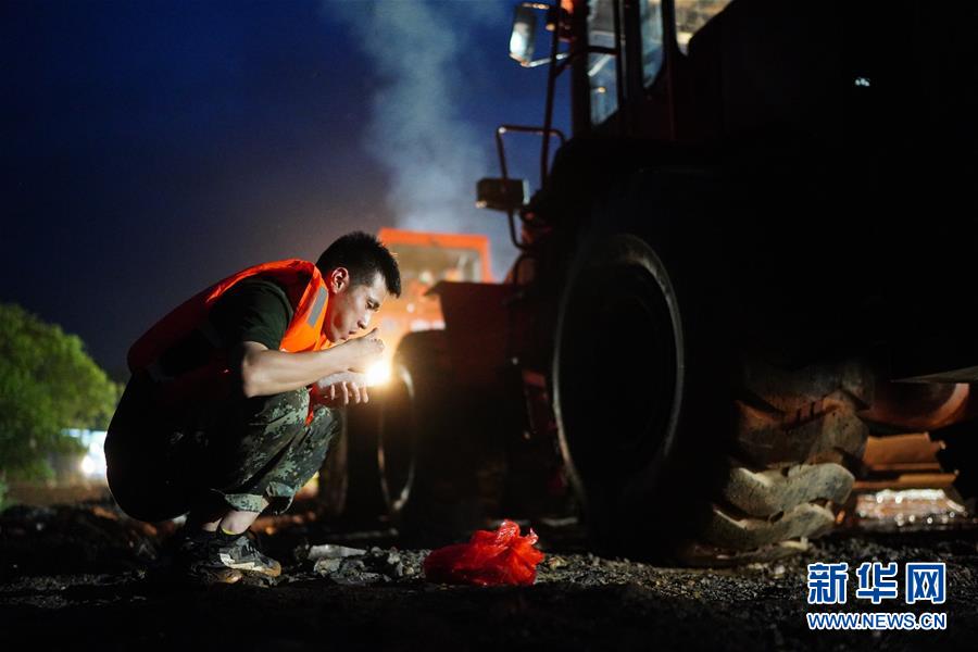 李群群在車輛旁邊的泥地上吃晚飯(7月10日攝)。來(lái)自山東的李群群是中國(guó)安能第二工程局南昌公司的一名裝載機(jī)操作手,之所以稱同事為“戰(zhàn)友”,是因?yàn)樗诘闹袊?guó)安能建設(shè)集團(tuán)轉(zhuǎn)制前是每逢搶險(xiǎn)救援都沖在一線的武警水電部隊(duì)。江西省鄱陽(yáng)縣問(wèn)桂道圩堤決口后,李群群和大部隊(duì)緊急趕到封堵現(xiàn)場(chǎng)開(kāi)始作業(yè)。新華社記者周密攝