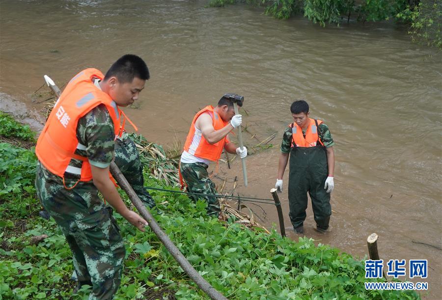 在鎮(zhèn)江市丹徒區(qū)世業(yè)鎮(zhèn)先鋒村西南大堤,中國(guó)安能集團(tuán)第二工程局常州分公司防汛前置備勤隊(duì)員在打樁,用來(lái)固定捆好的蘆葦(7月17日攝)。捆蘆葦護(hù)邊坡、機(jī)器人進(jìn)涵洞、“養(yǎng)水盆”防滲漏……在江蘇鎮(zhèn)江,當(dāng)?shù)馗刹咳罕姾蛯I(yè)力量,因地制宜就地取材,老辦法搭配新技術(shù),一批險(xiǎn)情得以消除在萌芽狀態(tài)。新華社記者季春鵬攝