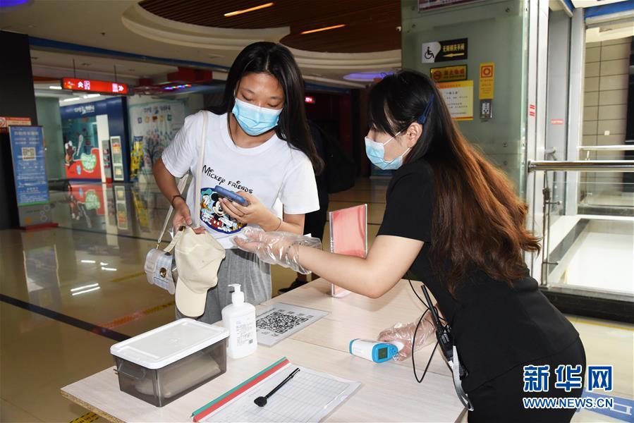 7月20日,濟(jì)南新世紀(jì)電影城陽光100店的員工(右)在核對觀眾的健康碼。當(dāng)日,山東濟(jì)南市部分電影院在嚴(yán)格防控疫情的基礎(chǔ)上陸續(xù)恢復(fù)開放。新華社記者王凱攝