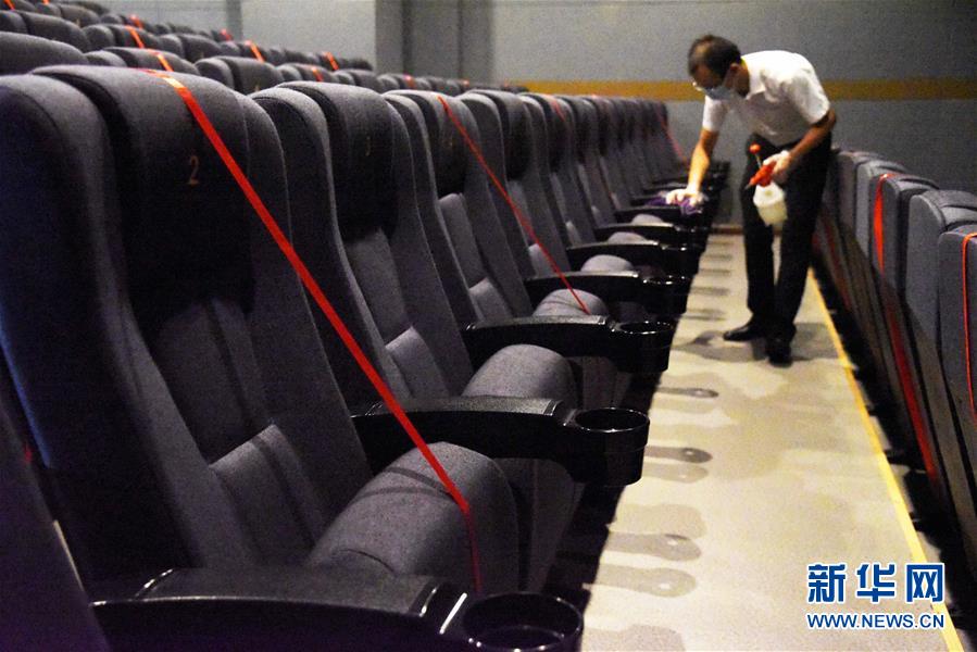 7月20日,濟(jì)南新世紀(jì)電影城陽光100店的員工在對影院設(shè)施進(jìn)行消殺。當(dāng)日,山東濟(jì)南市部分電影院在嚴(yán)格防控疫情的基礎(chǔ)上陸續(xù)恢復(fù)開放。新華社記者王凱攝