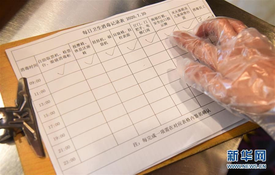 7月20日,濟(jì)南新世紀(jì)電影城陽光100店的員工在展示消殺記錄。當(dāng)日,山東濟(jì)南市部分電影院在嚴(yán)格防控疫情的基礎(chǔ)上陸續(xù)恢復(fù)開放。新華社記者王凱攝