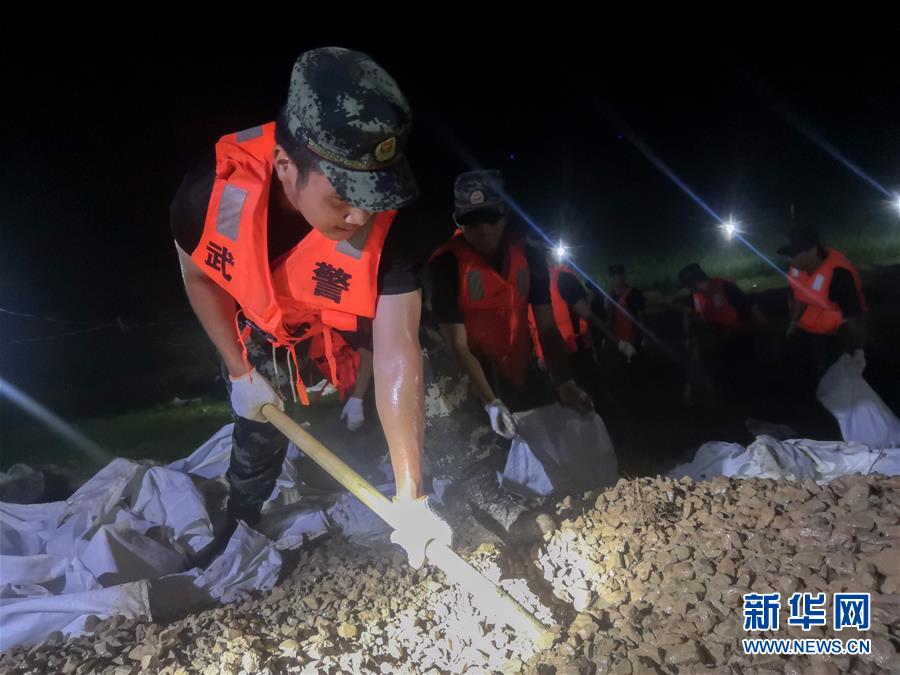 7月20日,在永固垸西線防洪大堤,武警湖南總隊岳陽支隊官兵處置滲漏險情。新華社發(fā)(尋樹文攝)