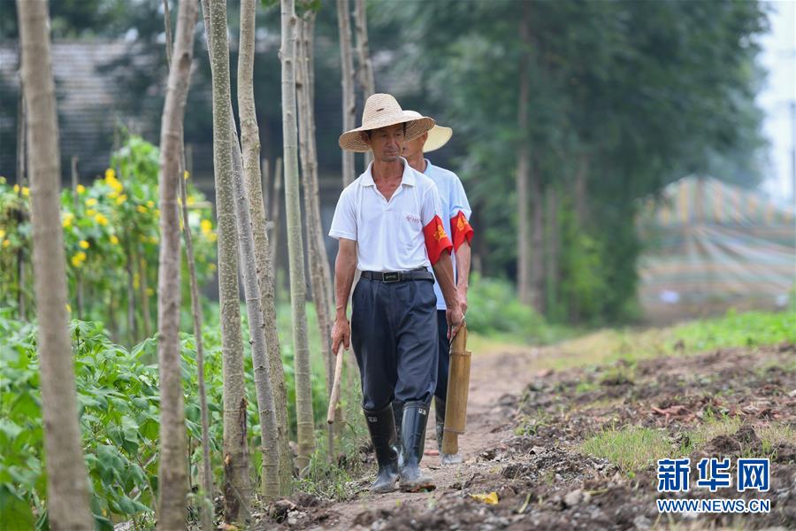 7月20日,在永固垸西線防洪大堤,工作人員巡堤查險(xiǎn)。新華社記者陳澤國攝