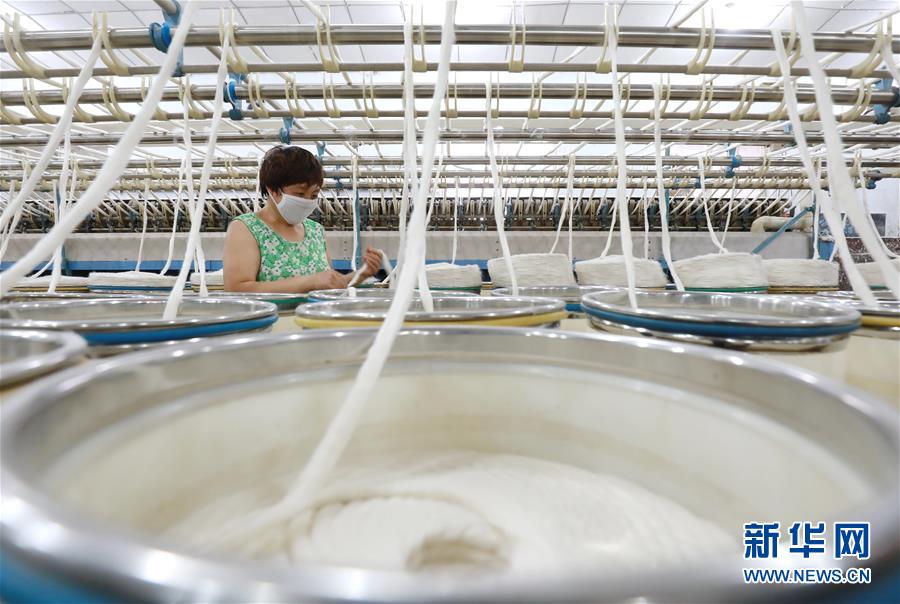 7月20日,工人在灤南縣長凝鎮(zhèn)的一家紡織廠生產(chǎn)車間里工作。近年來,河北省灤南縣大力發(fā)展村邊民營企業(yè),引導(dǎo)企業(yè)在鄉(xiāng)鎮(zhèn)村邊建廠,帶動當(dāng)?shù)?萬多名農(nóng)村群眾在村邊就近就業(yè),實現(xiàn)穩(wěn)步增收。新華社記者楊世堯攝
