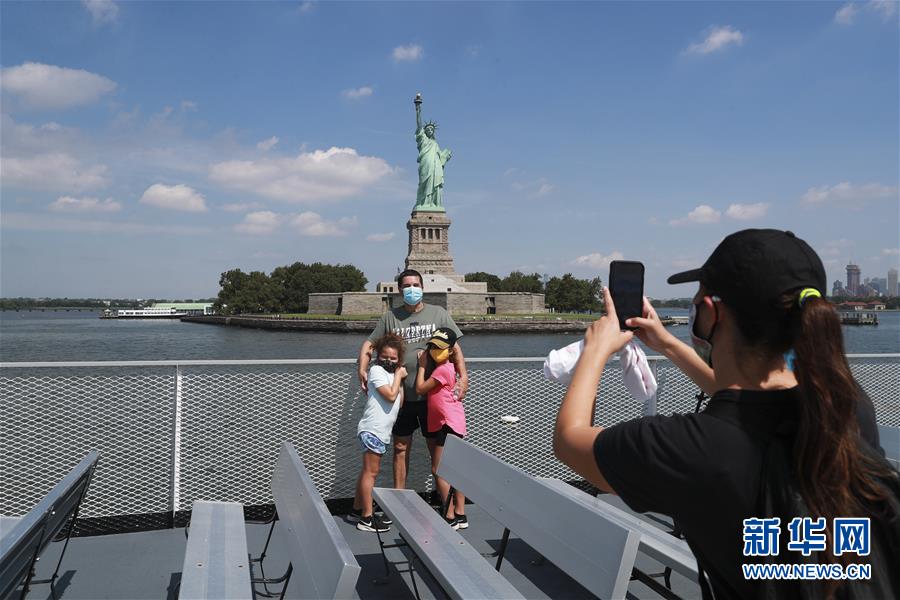 7月20日,參觀者在美國紐約前往自由島的游艇上拍照留念。美國紐約市20日繼續(xù)推進經濟重啟計劃,宣布開始進入解封新階段,進一步允許部分低風險文娛活動重啟。自由女神像所在的自由島對公眾開放,但雕像內部和博物館仍關閉。新華社記者王迎攝