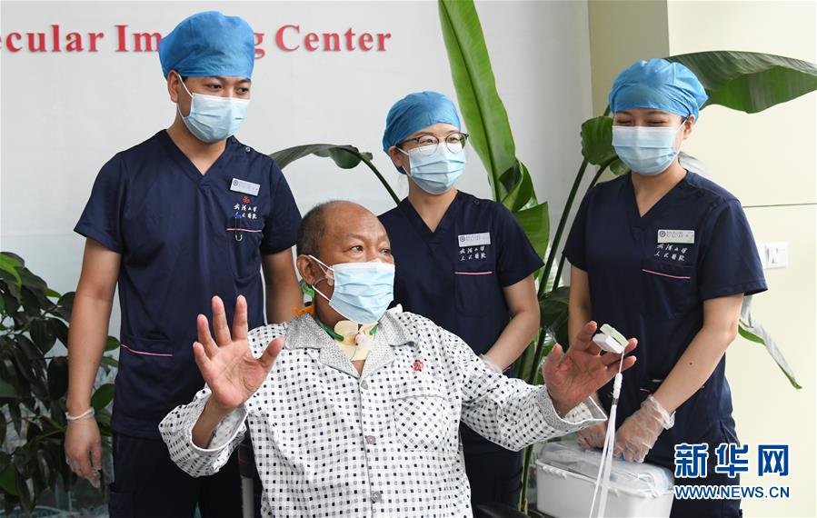 7月21日,準(zhǔn)備出院的崔先生向大家致意。新華社記者程敏攝