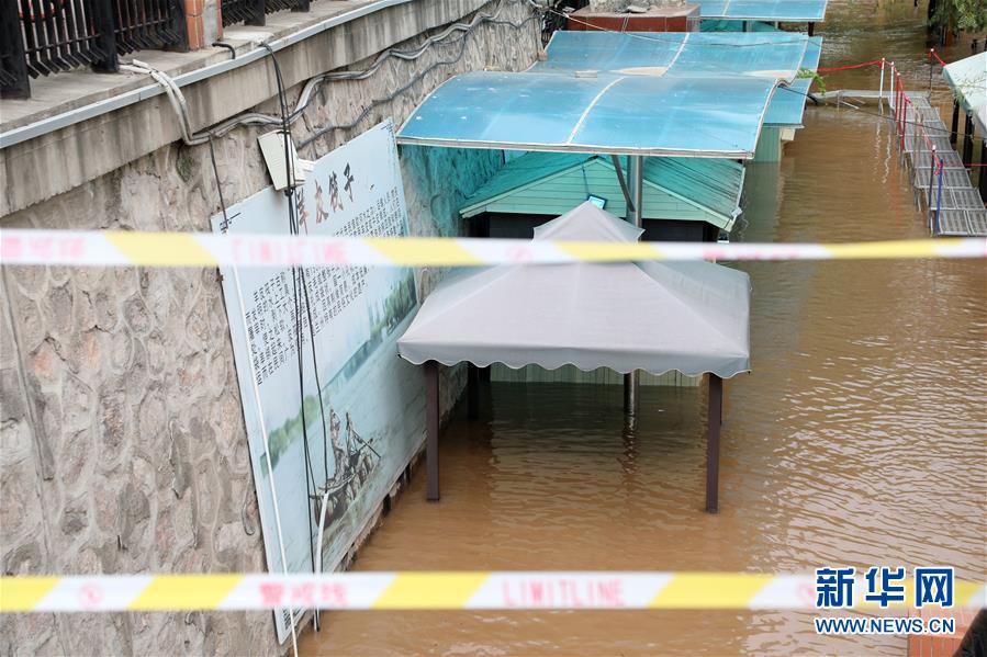 在蘭州市城關(guān)區(qū)黃河蘭州段南岸,被淹的羊皮筏子售票處門口拉上了警戒線(7月21日攝)。據(jù)了解,受降雨影響,黃河蘭州以上來水持續(xù)增加,黃河蘭州水文站7月20日20時42分流量達(dá)到3000立方米每秒,出現(xiàn)黃河2020年第2號洪水。新華社記者馬莎攝