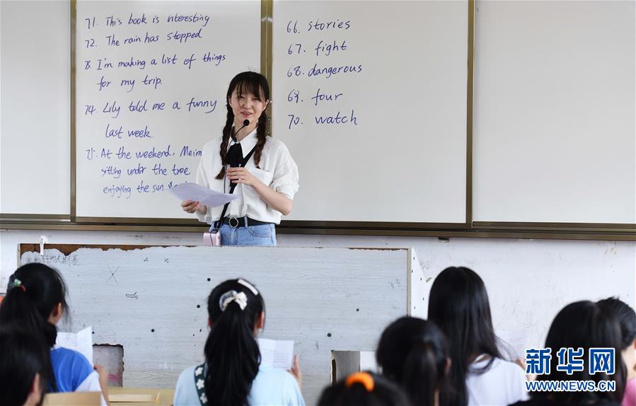 在融水苗族自治縣民族中學(xué)1818班舉辦的送別班會上,支教老師高潔給同學(xué)們上最后一節(jié)英語課(7月23日攝)。新華社記者黃孝邦攝